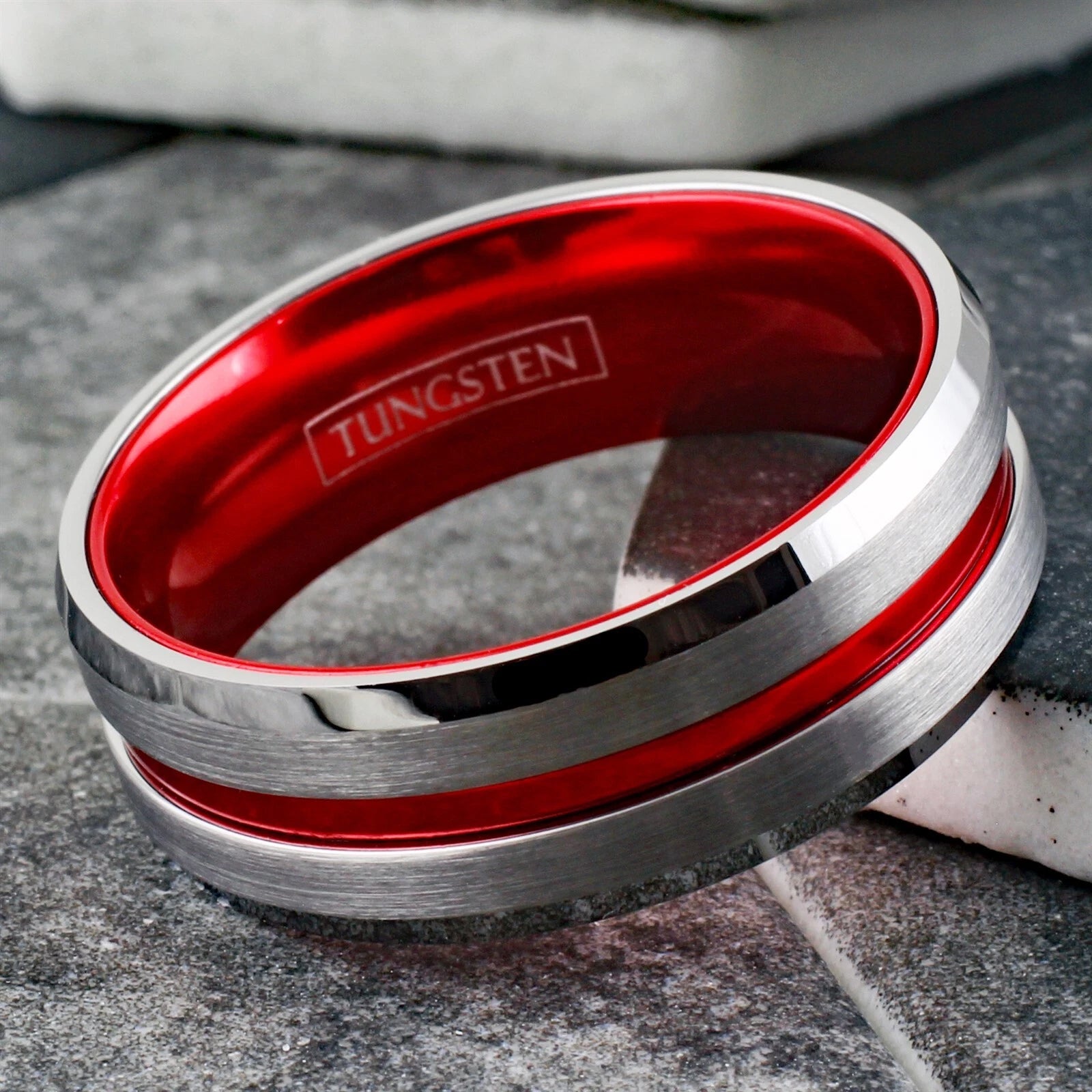Beautiful silver tungsten ring in brushed satin finish with a beautiful recessed soft red stripe, matching soft red inner band, and polished beveled edges.